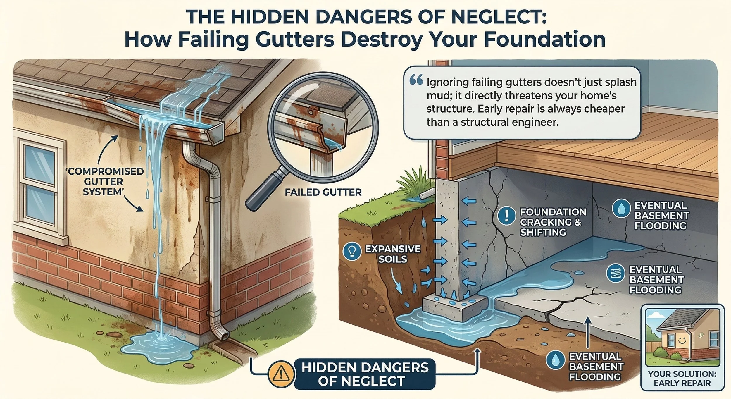 Ignoring a compromised gutter system does not just result in a little splashed mud; it directly threatens the structural integrity of your home.